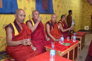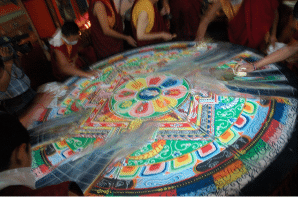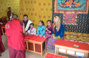 In Punakha we visited the city’s Dzong (a mixture fortress, monastery, government offices, and court house). The Lama of the Dzong was impressed that we made the children wear Kira as a sign of respect. So he invited us to celebrate one of his junior monk’s recognition as master mandala maker. Mandalas are the highly symbolic art pieces that are painted on buildings, and canvas throughout the Buddhist world. In some ceremonies, the artists spend weeks creating mandalas of colored sand only to sweep it away in an acknowledgment of the impermanence of reality.