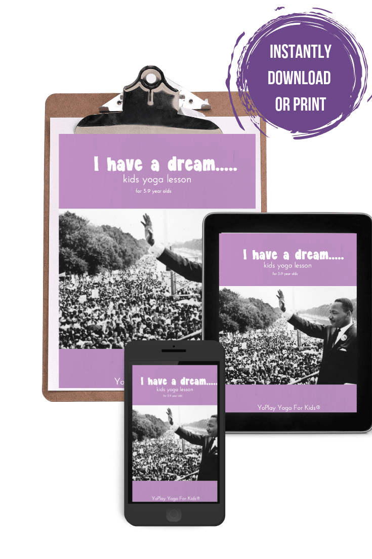 This original YoPlay Yoga For Kids Lesson Plan contains easy to follow, step-by-step instructions. Written by YoPlay Yoga For Kids® Founder, Jen Byer, she’ll show you how to infuse this “I Have A Dream” theme into a fun light-hearted kids yoga class, specifically designed for 3-9 yr. olds. *with options for * Tweens / Teens