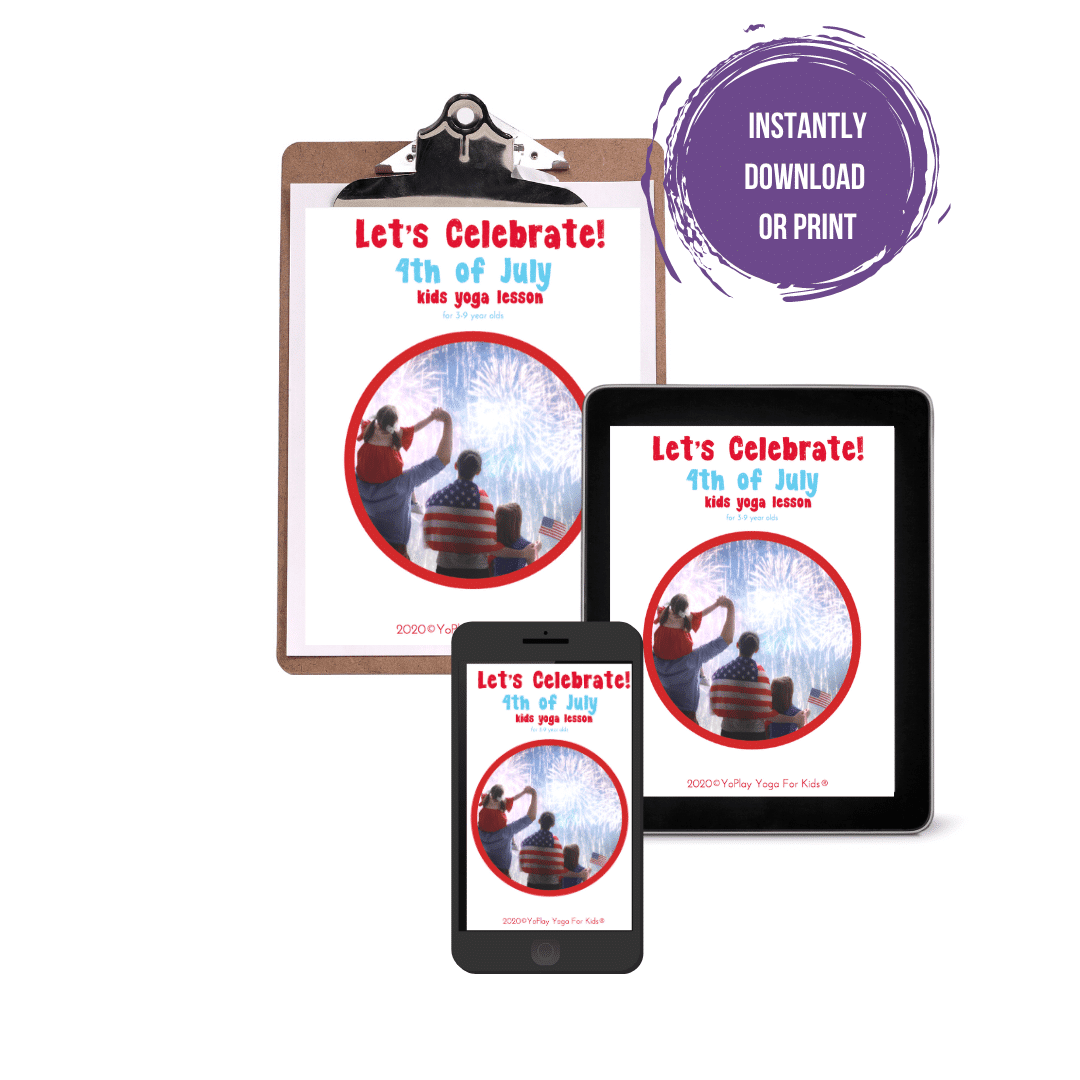 This original YoPlay Yoga For Kids Lesson Plan contains easy to follow, step-by-step instructions.   Written by YoPlay Yoga For Kids Founder, Jen Byer, she’ll show you how to infuse the “Let’s Celebrate: 4th of July Yoga” theme into a class, specifically designed for 3-9 yr. olds.